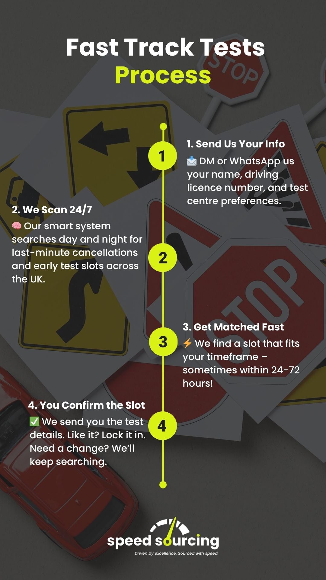 No matter where you are in the UK, we search every test centre to find the earliest possible slot that suits your schedule.